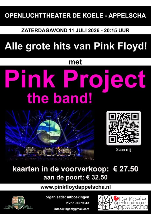 In het idyllisch gelegen openluchttheater De Koele in Appelscha zullen op zaterdagavond 11 juli 2026 in een maar liefst ruim twee uur durende show alle grote hits van de legendarische band Pink Floyd ten gehore worden gebracht door Pink Project the band! Deze band bestaat inmiddels al weer ruim 30 jaar en was een van de eerste Pink Floyd Tribute bands van Europa! Pink Floyd was, als een van de meest succesvolle – en invloedrijke bands, pionier van de progressieve rock en symfonische muziek. Zo was de band in de Top 2000 van 2024 vertegenwoordigd met maar liefst 16 nummers! Pink Project the band! zal hun optreden vergezeld doen gaan van een fantastische lichtshow en quadrafonische geluidseffecten. Dit alles is op voorhand al een garantie voor een onvergetelijke avond.