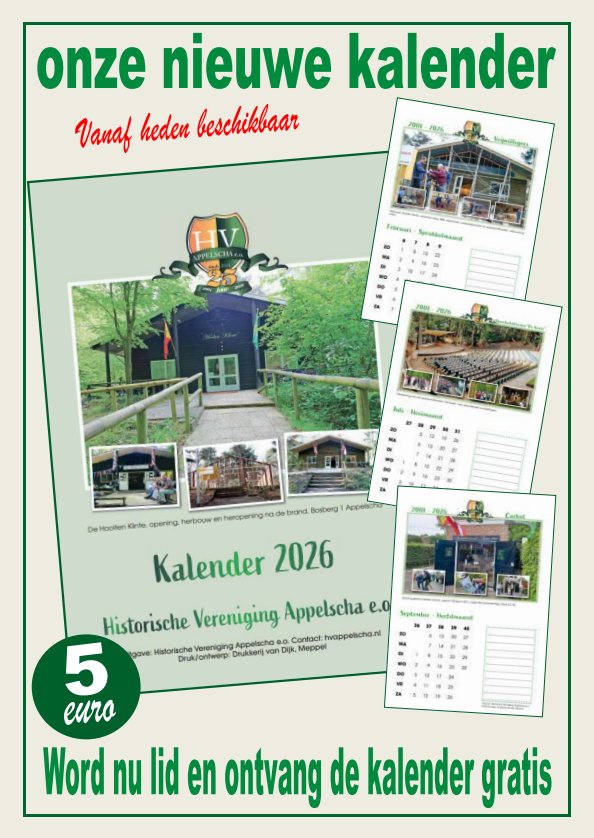 | Voor 2026 heeft de Photo Prentbriefkaart Club van de Historische Vereniging een jubileum kalender samengesteld. Met een terugblik op de afgelopen 25 jaar. We hebben gekozen voor een full colour uitgave, en dat voor onze vaste prijs van 5 Euro. Vanaf september zijn we met de verkoop bezig, misschien heeft U ons al getroffen, teven zijn ze op de dinsdagmorgen in de Hoolten Klinte Bosberg 1 te koop. |