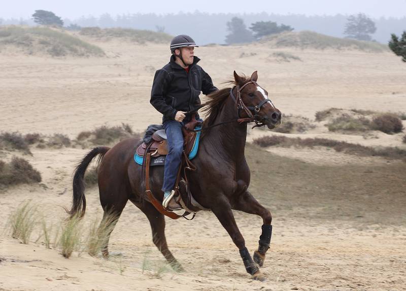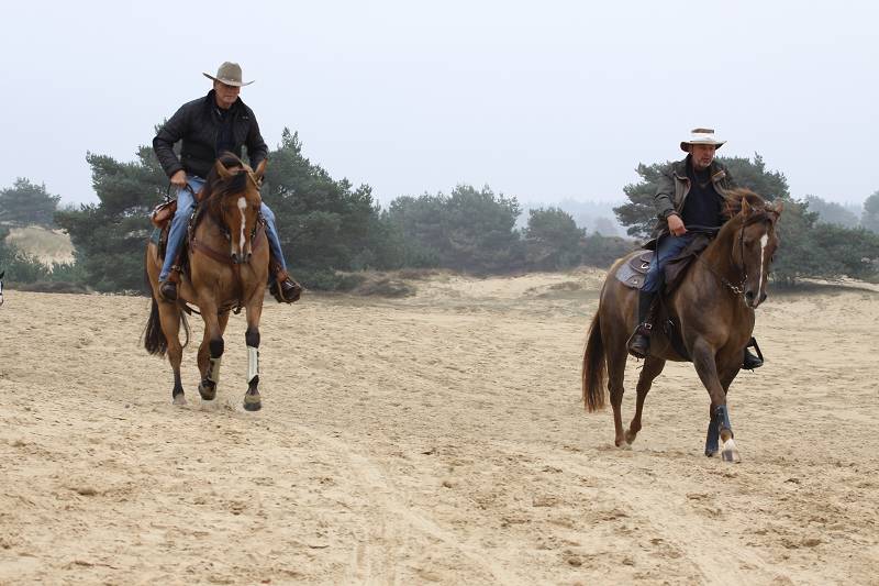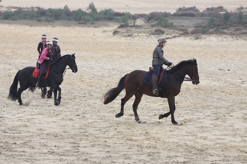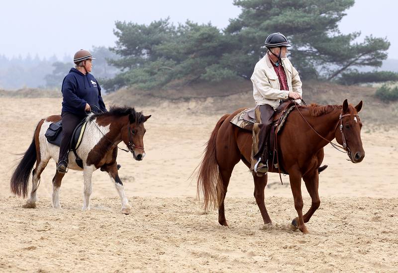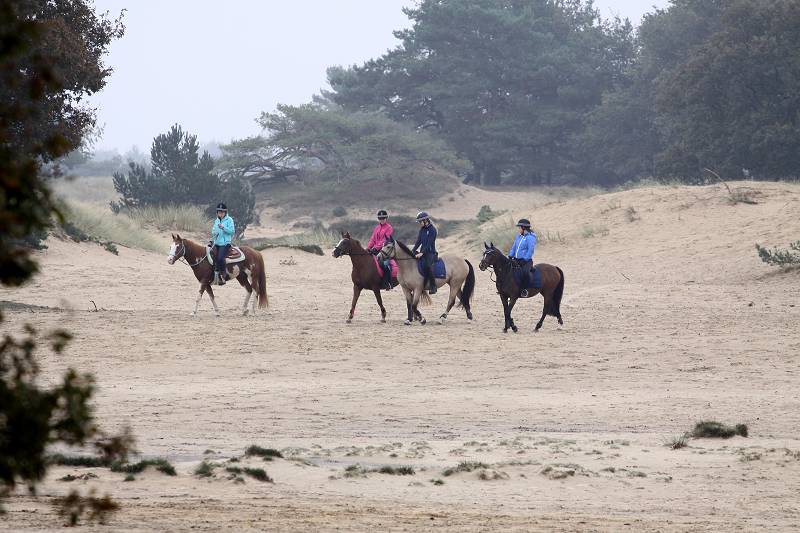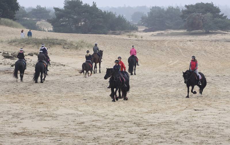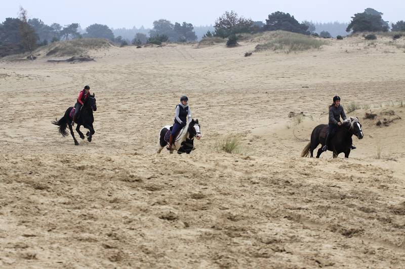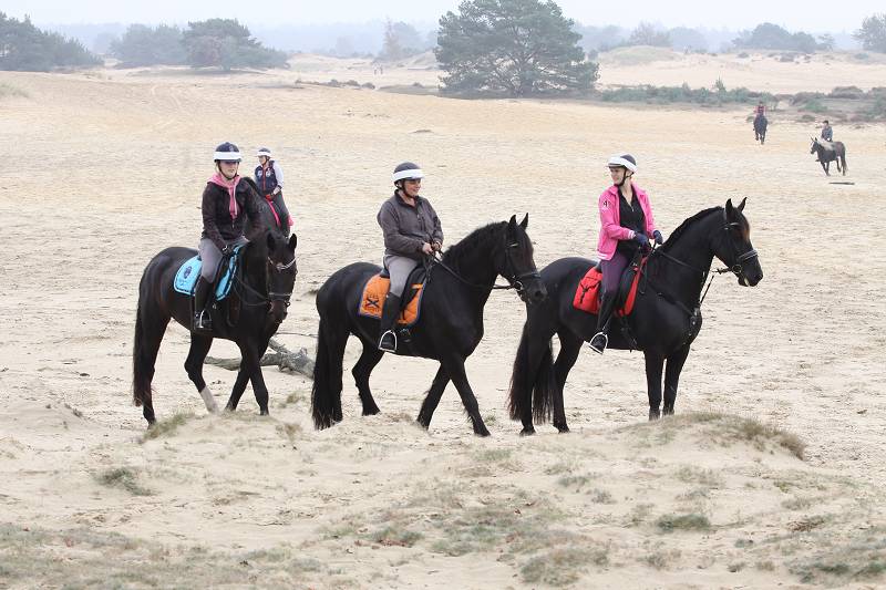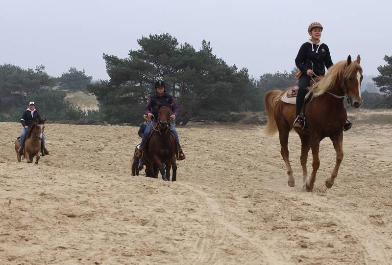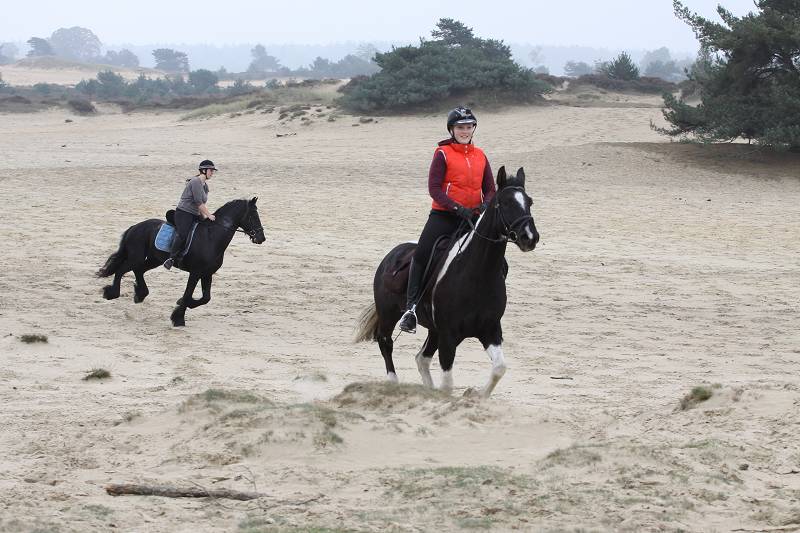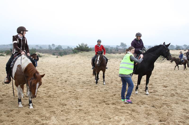 | Zondag vond voor de derde keer de Autumn desert trail op de Kale Duinen plaats. Deze rit werd georganiseerd met de bedoeling het stuifzand van de grote zandoppervlakte ook in de winterperiode weer te laten stuiven. Door lage temperaturen kan het zand niet voldoende stuiven en gaan er mossen groeien die niet thuis horen in dit unieke stuifzandgebied. Doordat de paarden het zand omwoelen kan het worden losgemaakt en weer gaan stuiven. 330 liefhebbers deden aan deze 25 kilometer lange rit mee. Op ongeveer de helft van de tocht had Staatsbosbeheer een tent neergezet en kon een beker warme chocolademelk worden gedronken. Hier kwamen ook de reacties van de ruiters los, gaaf, prachtig en heel bijzonder waren de reacties die bij de chocotent werden gehoord. Aan de tocht was ook een spelelement gekoppeld, op bepaalde punten kon men vragen beantwoorden wat betrekking had op de omgeving van de Kale Duinen. |
